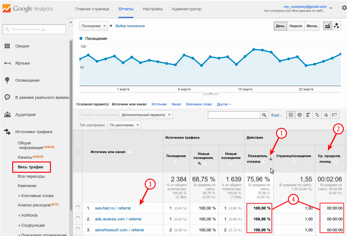 Aby to zrobić, w lewym menu Google Analytics otwórz statystyki „ Źródła ruchu> Cały ruch ” i posortuj dane według wskaźnika awarii lub średniego czasu trwania wizyty, klikając nagłówek tabeli (punkty 1 i 2 na rysunku):